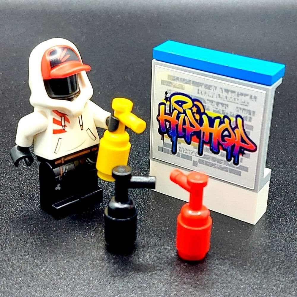 One genuine LEGO® Artist minifigure with three spray cans and artwork wall accessories exactly as shown in the photos.